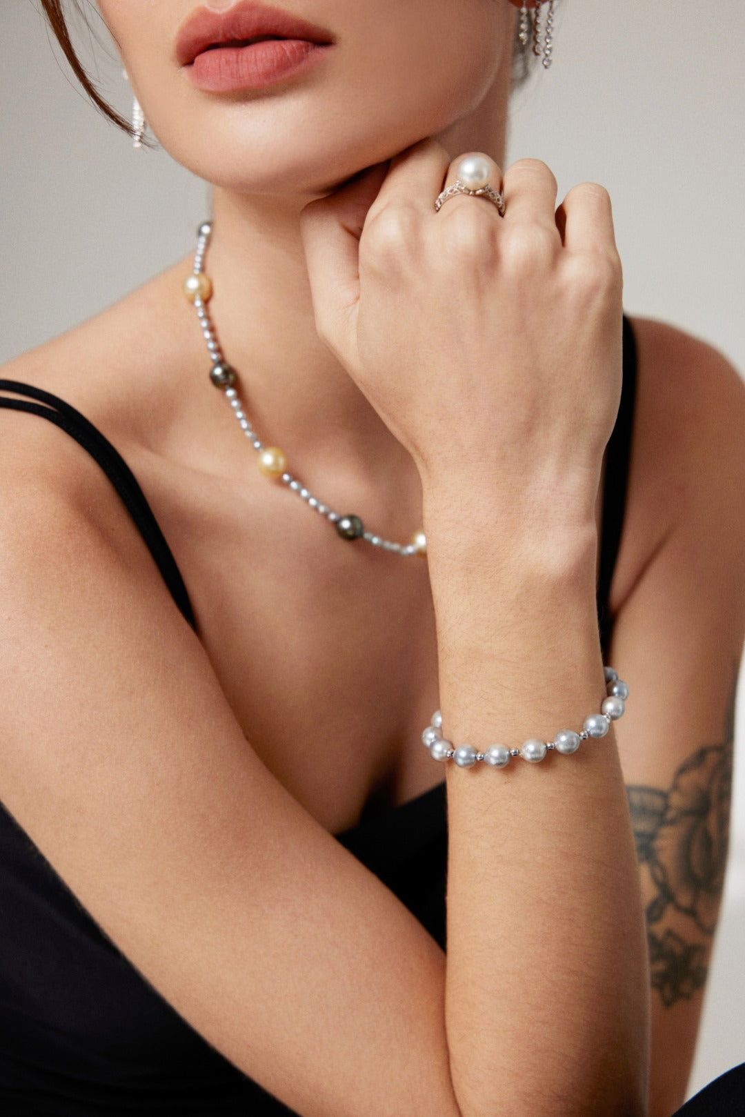 Akoya Saltwater Pearl Bracelet. This bracelet features Akoya pearls, renowned for their exquisite luster and elegant beauty. The pearls are presented in Shindo Tama’s luxurious gray, a sophisticated hue that radiates with vibrant iridescent overtones, making each pearl uniquely mesmerizing.