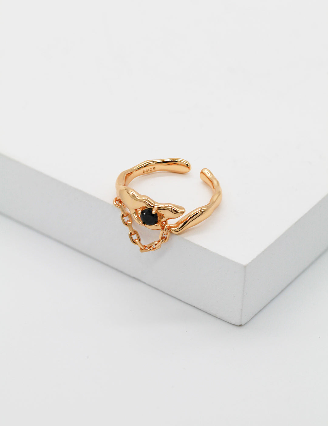 Ring crafted uniquely with an irregular branch-like design extension, accompanied by an interactive chain structure for added intrigue. Adorned with black zircon, creating exquisite fingertip embellishment.