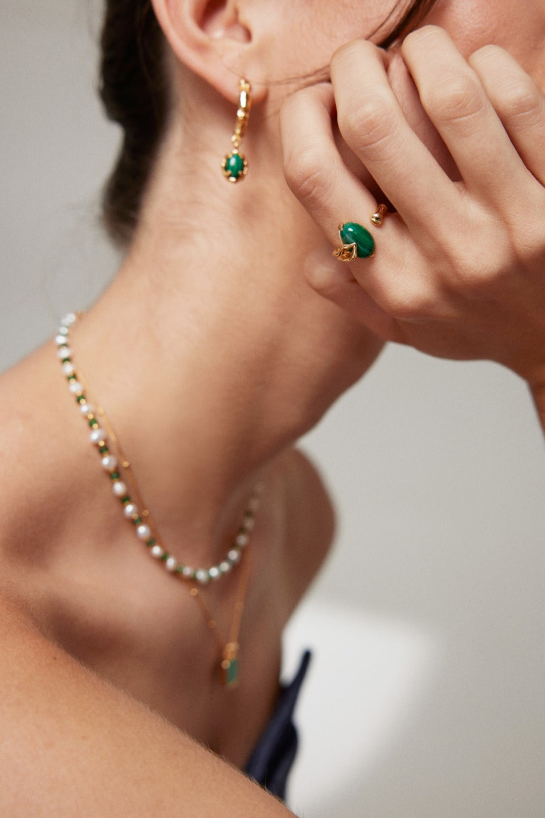 Green natural malachite ring, each showcasing their unique charm, are set in an organic, fluid design. The combination is exquisitely sophisticated, yet fashionably simple.