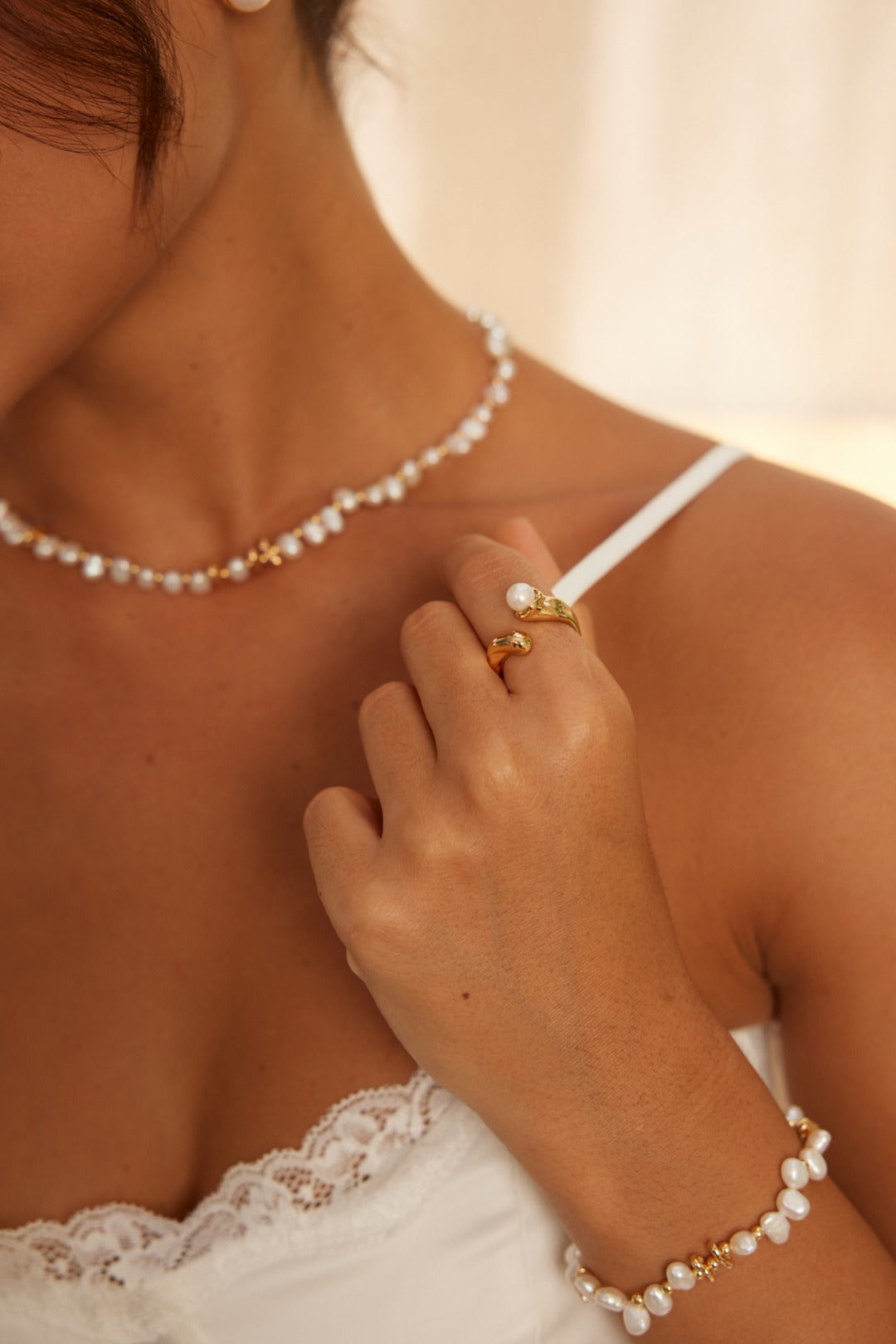 Sterling Silver Pearl Bridal Ring, a stunning addition to any bridal jewelry set. Inspired by the beauty of nature, the S925 sterling silver flows like liquid around the luminous natural pearl, creating a breathtaking design that symbolizes elegance and purity. The pearl sits delicately on your finger, resembling stars surrounding the moon, making it the ideal ring for brides seeking timeless beauty.